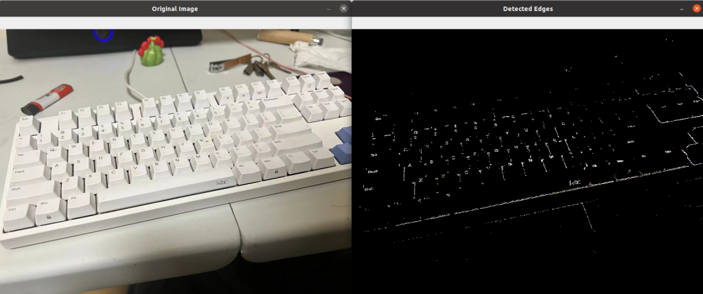 # 显示原始图像和检测到的边缘# 两张图片二合一# resize 按0.5比例cv2.imshow('Original Image', cv2.resize(image, (800, 600)))cv2.imshow('Detected Edges', cv2.resize(edges, (800, 600)))