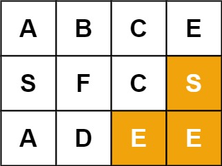 **输入:**board = [[“A”,“B”,“C”,“E”],[“S”,“F”,“C”,“S”],[“A”,“D”,“E”,“E”]], word = “SEE” **输出:**true