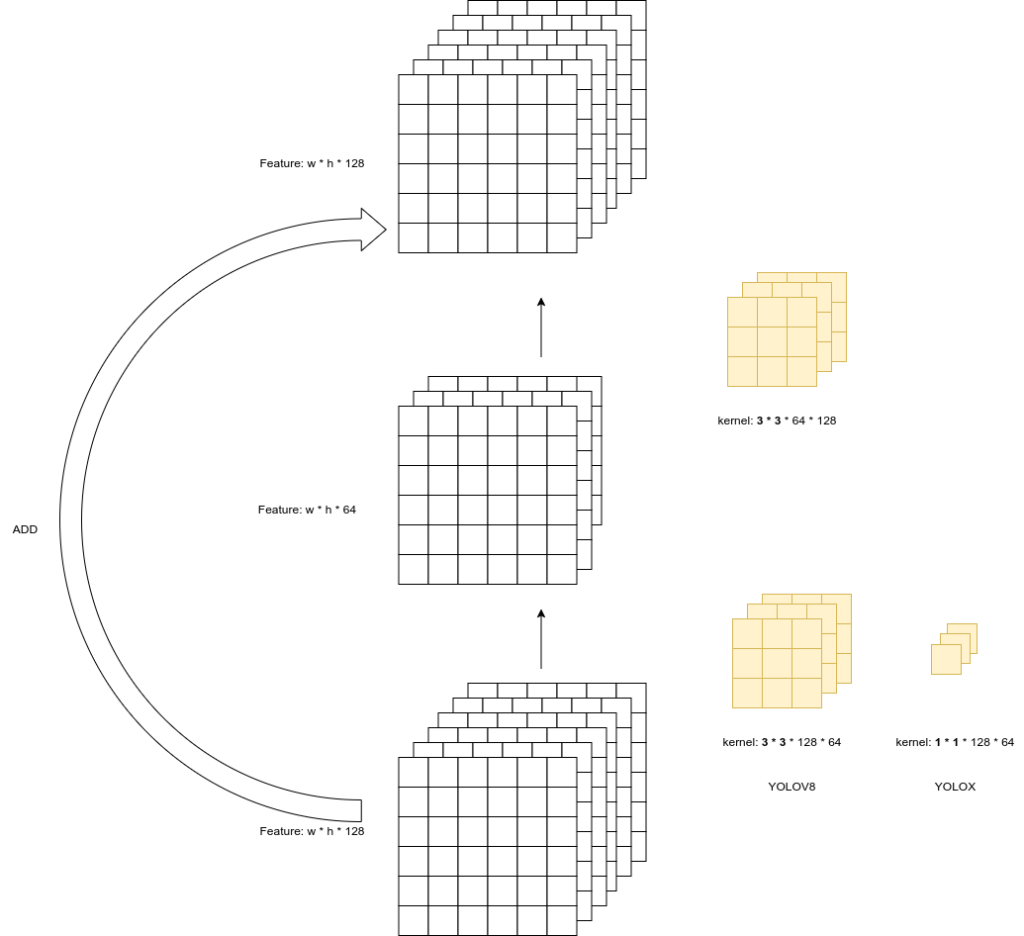 def forward(self, x): y = self.conv2(self.conv1(x)) # 1x1卷积,3x3卷积 if self.use_add: # 如果使用shortcut,则将输入的特征图和卷积后的特征图进行相加 y = y + x # shortcut return y# Bottleneck的数据流图如下:# x -> conv1(1x1) -> conv2 -> y# |______________________|# 其中conv1是1x1卷积,conv2是3x3卷积# W*H*C -> W*H*C/2 -> W*H*C -> W*H*C# 通道数从C变为C/2,然后再变为CYOLOV8